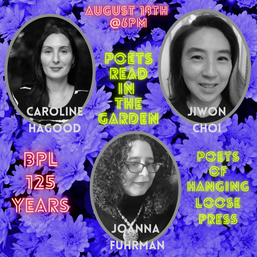 Come on down to the Park Slope branch of the Brooklyn Public Library on August 18th at 6pm for poets Caroline Hagood, Joanna Fuhrman and Jiwon Choi who will read their poetry out loud in the library’s garden space. The BPL is celebrating 125 years of serving all the great neighborhoods of Brooklyn.